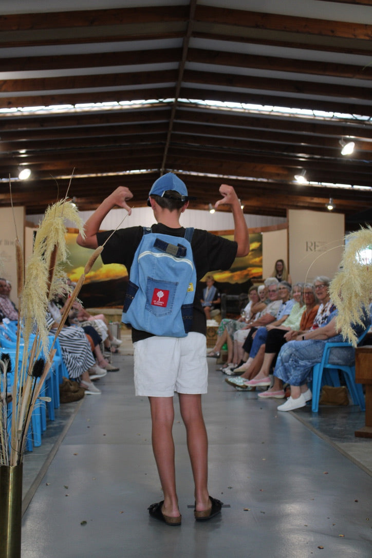 Working in small groups, students design their own products — bags, caps, accessories — and we bring those designs to life using recycled and upcycled materials sourced right here in Ranfurly. The denim for their backpacks and caps comes straight from the local op shop. Nothing new, nothing wasted, everything reimagined.